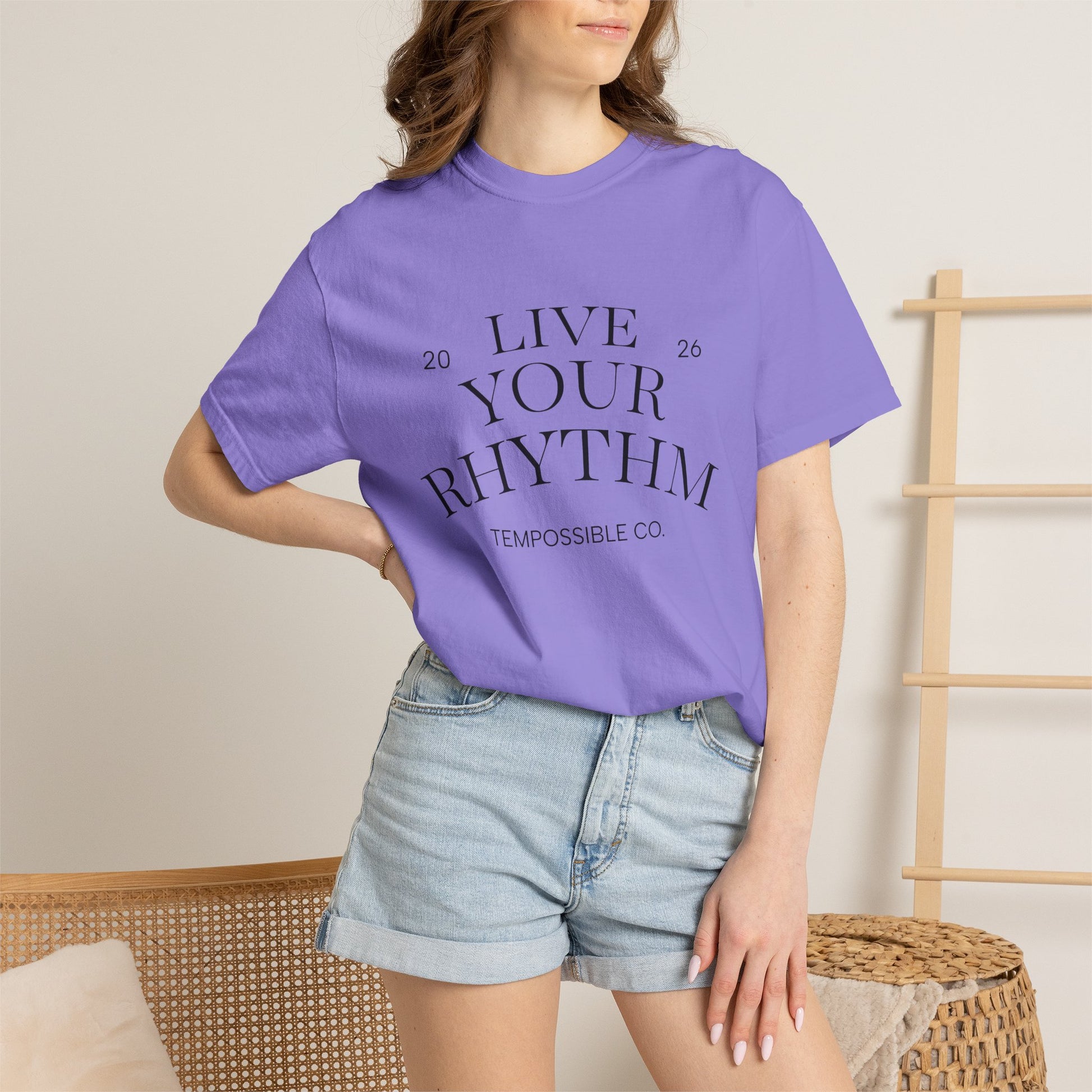 This relaxed-fit tee carries a quiet confidence — soft, garment-dyed cotton with a calm, minimalist design that reads like a personal mantra. Front text reads “LIVE YOUR RHYTHM” in elegant, slightly arched type with a small founding-year detail, while the back features a tiny, hand-drawn metronome illustration. It sits comfortably through long rehearsals, morning walks, or low-key nights out. The heavyweight cotton holds shape and the garment-dyed finish gives each shirt a lived-in softness and subtle color depth that improves with every wash. Wear it when you want your look to be understated but intentional — a gentle statement for music makers, rhythm lovers, and anyone carving out their own tempo.